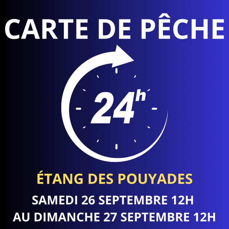 La carte de pêche 24h pour l’Étang des Pouyades permet d’accéder au site pendant une durée continue du samedi 26 septembre 12h au dimanche 27 septembre 12h.